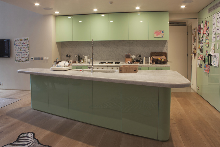 An old Post Office dating back to 1894 in the Victoria District, near Buckingham Palace, has been housing for some years art galleries, artists, stylists, etc. The challenge for Sébastien Segers is to design very fluid spaces inside this Victorian building. The 300 square metres flat has very few right angles and has only eight windows. The Architect creates two volumes, one being 5,50 metres high and the other one 4 metres. The first volume has a free open layout where are located the sitting room, the dining room and the kitchen. A mezzanine creates an extra level. Tradition and contemporaneity are mixed with no inhibition. A huge pebble wall, as a reference to the American villas of the 50’s, an ancient type of parquet made of solid oak large lathes and a chimney bring warmth to this large area, the walls are coated with a plain rendering. The furniture in the kitchen is pastel green lacquer: this colour is one of the colours of the range of colours prepared by Marc Newson for Smeg. A huge marble worktable connects the sitting room area to the kitchen.