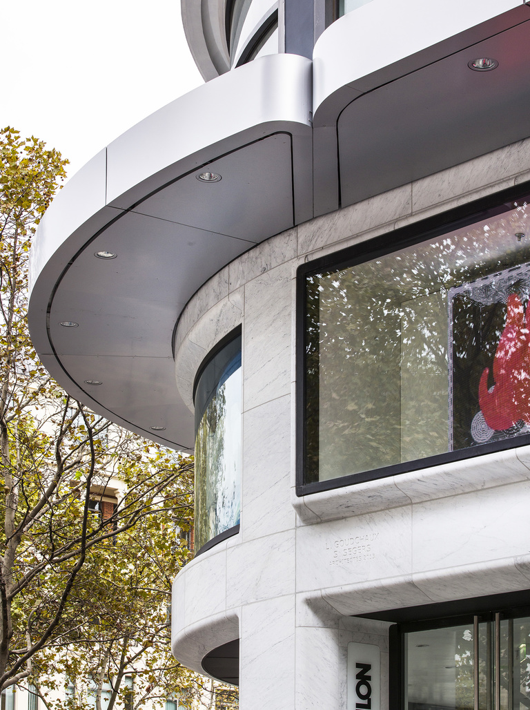 The new facade is cladded with bright Carrare marble from the Quarry of “Campanili Marbles” and looks like a sculpted monolith. It is made of the assembly of thousands of elements, all precisely designed, modelised and numbered in three dimensions for a perfect fitting. This sensual mineral mass, with a fine rubbed finish, includes both flat and curved surfaces and protruding and recessed show windows. An abyss setting of the profiles of the ogees, in and out, ensures that the whole assembly has an aesthetical homogeneity.